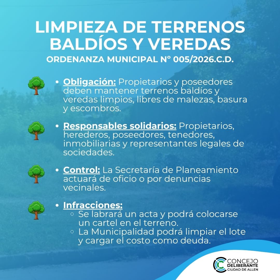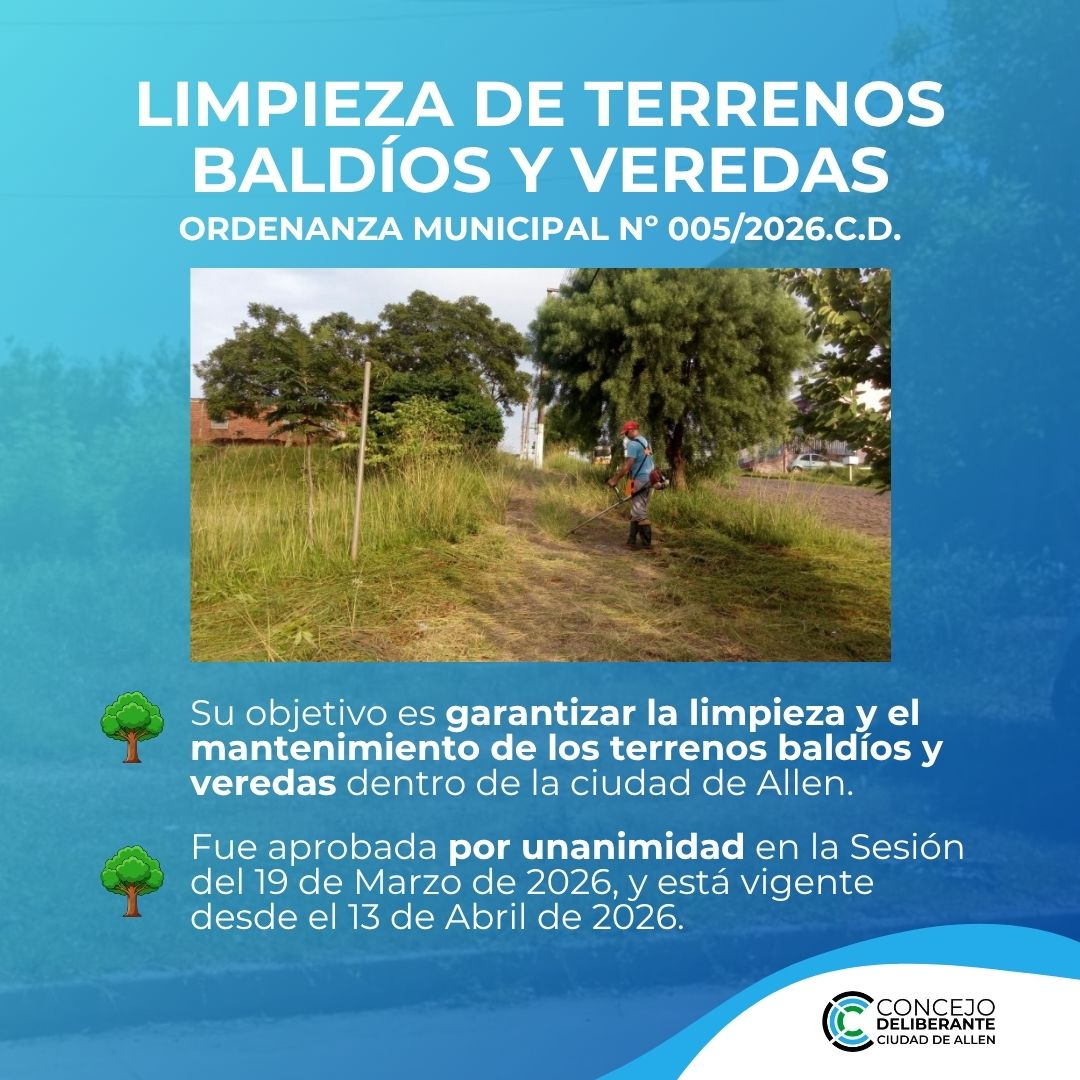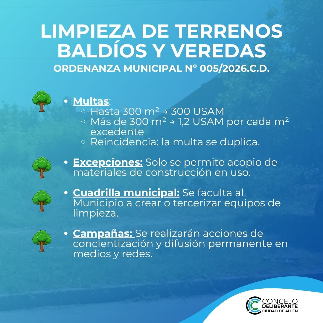 Artículo 3º: Será obligatorio mantener los terrenos baldíos y veredas limpios, libres de malezas, retoñales de árboles, basura, residuos y todo género de materias que signifiquen un riesgo para la salud pública. A excepción de aquel acopio de materiales de construcción que oportunamente fueran depositados para su posterior utilización por el propietario o terceros con autorización.
